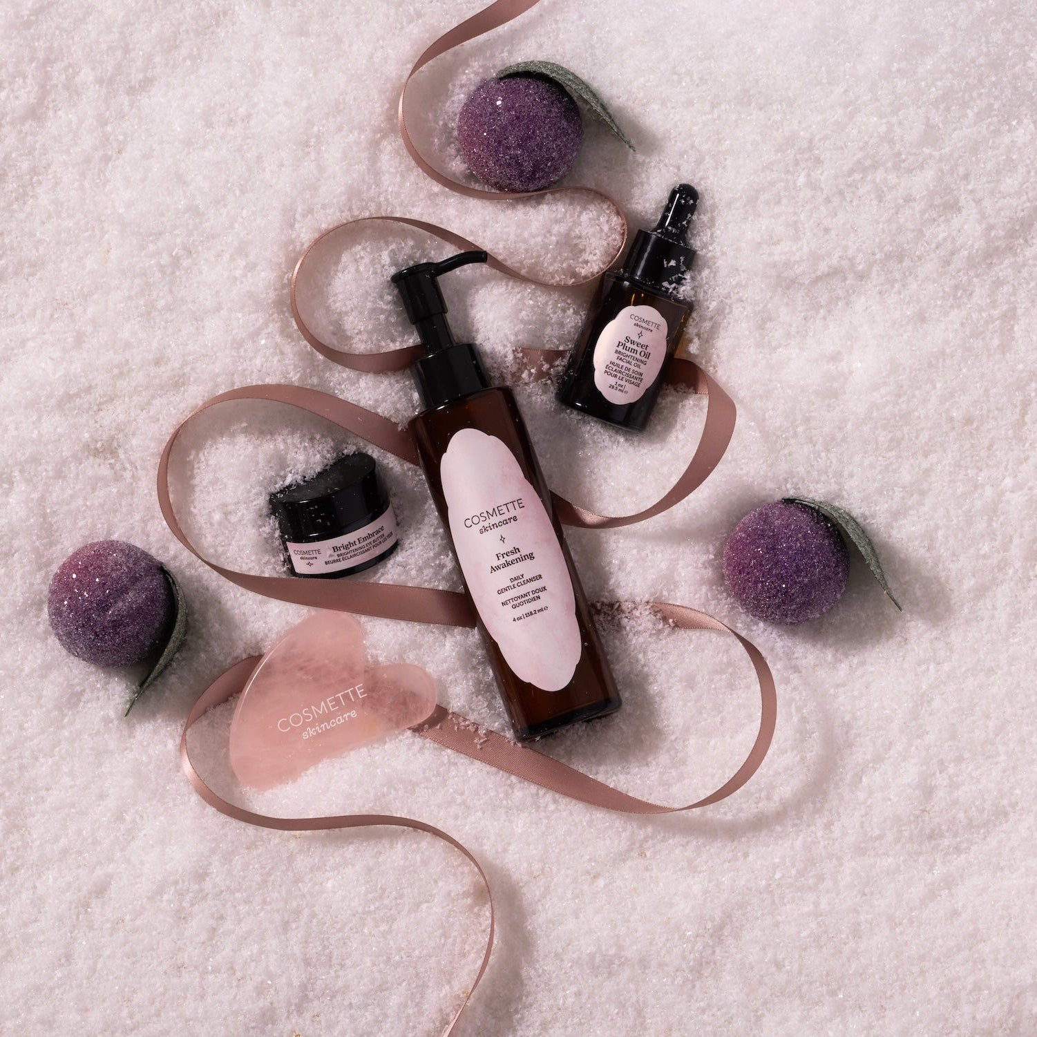Brighten dark pots, target dark circles, and cleanse without stripping with this three-step effortless holiday ritual that will leave you with an effortless glow. Includes our exclusive holiday scarf and our custom gua sha tool.